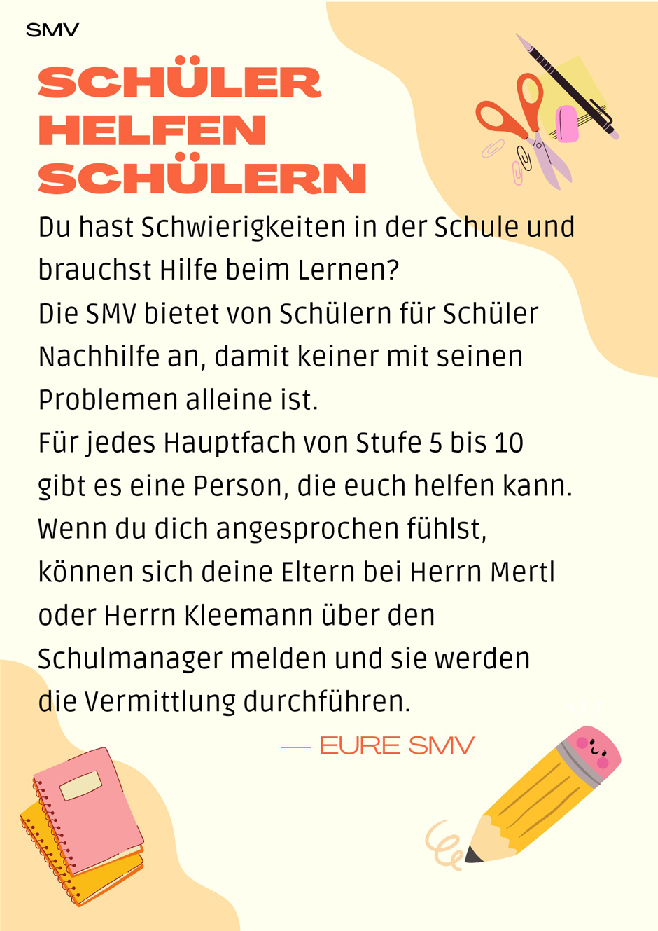 SMV bietet von Schülern für Schüler Nachhilfe an! Hier findest du