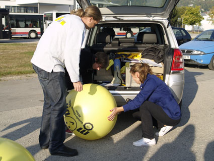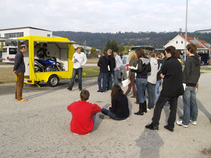 Für die Schülerinnen und Schüler der 11. Jahrgangsstufe stand am 28. September und 1. Oktober das Projekt „Mobil mit Köpfchen“ an. Dieses Projekt wird vom ADAC Südbayern mit Unterstützung des Kultusministeriums und des Umweltministeriums für Gymnasien angeboten. Das zentrale Anliegen dieser Veranstaltung ist die Verkehrssicherheit und vor allem das Umweltverhalten der motorisierten Verkehrsteilnehmer. Die jungen Leute sollen dabei lernen, wie man kostengünstig, lärmreduziert, umweltgerecht und sicher fahren kann. Für die Durchführung war der ADAC-Moderator Stefan Straubinger anwesend. Er unterrichtete die Schülerinnen und Schüler auf dem Beilngrieser Volksfestplatz über unterschiedliche Lärmpegel und über die Auswirkungen von Lärm. Die Schülerinnen und Schüler konnten ganz praktisch die Auswirkungen unterschiedlicher Fahrweisen kennen lernen: Sie sollten den Geräuschpegel eines Pkw messen, der zuerst langsam und dann immer schneller fuhr. Sie erfuhren, welche Konsequenzen ein „Kavalierstart“ für die Reifenabnutzung und den Benzinverbrauch hat. Sie beobachteten die Folgen lauter Musik auf das Wahrnehmungsvermögen eines Autofahrers, der ab einer bestimmten Lautstärke selbst ein Martinshorn nicht mehr hören kann. So sollten die Teilnehmerinnen und Teilnehmer der 11. Jahrgangsstufe überzeugt werden, dass ein umweltschonendes Fahren sinnvoll ist.