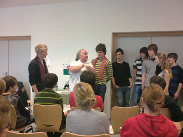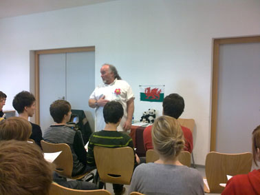 Wie schon in den vergangenen Jahren durften wir an unserer Schule am Mittwoch, 24.3.10 Jim Wingate willkommen heißen. In den 6., 8. und 11. Klassen begeisterte der Schotte, der seit mehreren Jahren in Wales wohnt, unsere Schülerinnen und Schüler mit heiteren als auch thematisch anspruchsvollen Geschichten und Texten aus der englischsprachigen Welt. Der storyteller versteht es ungemein, seine Zuhörer schon nach kurzer Zeit in seinen Bann zu ziehen, einzubinden und zum Mitmachen zu bewegen. Kein Wunder, dass es selbst in den unteren Jahrgangsstufen niemandem schwer viel, seinem Englisch zu folgen und in die Welt der stories einzutauchen. In der 11. Jahrgangsstufe beschäftigte sich Wingate mit William Shakespeare: Jim brachte den Schülern ein berühmtes Sonett näher, zeigte unterschiedliche Interpretationsmöglichkeiten des Stückes Macbeth auf und spielte mit den Schülern eine vereinfachte Zusammenfassung des Stückes King Lear, dessen Inhalt die Schüler aufgrund der ungewöhnlichen Umsetzung wohl nicht so schnell vergessen werden. Jim Wingate ist jedes Jahr als storyteller und Ausbilder unterwegs und hat aus diesem Grund schon 44 Länder der Erde bereist. Schön, dass Beilngries auch in diesem Jahr wieder auf seinem Weg lag…