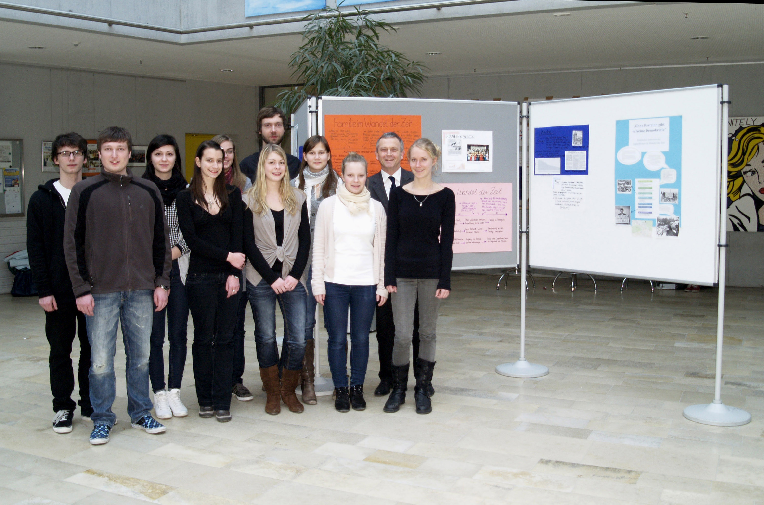 Doch begonnen werden, musste erst einmal mit dem Erlernen der Grundlagen: Wie führe ich ein Interview? Wie gehe ich adäquat auf mir unbekannte Personen zu? Und wie kann ich das herausfinden, was ich wissen möchte? Um uns diese Techniken näher zu bringen, organisierte Herr Habermann sogar den Besuch eines befreundeten Journalisten. Im Juni 2010 stand uns Markus Erlwein, ein schon bei verschiedenen Zeitschriften (u.a. Musikmagazin VISIONS, Kicker Sportmagazin) beschäftigter Journalist, mit gutem Rat zur Seite. Mit den richtigen Strategien an der Hand, konnte nun weiter vorbereitet werden. Wir teilten uns in drei Gruppen auf, jede für eine andere Altersgruppe zuständig, von den Geburtenjahrgängen der späten 1930er bis hinein in die späten 1970er. Fragenkataloge wurden erstellt, und die ersten Interviewpartner angeworben. Die Suche erwies sich anfangs als nicht allzu einfach, waren doch Verwandte aus der Zielgruppe wegen möglicherweise eher zurückhaltenden Erzählungen ausgeschlossen worden. Doch schließlich wurden die ersten Zeitzeugen zu Themen wie Schule, Familie, Freunde und Beziehungen, Trends und Freizeit befragt und die Gespräche gewissenhaft mit den eigens fürs Seminar erworbenen Diktiergeräten aufgenommen. So entstanden ca. 30 Interviews mit Befragten aus allen Tätigkeitsbereichen, von der Hausfrau bis zur lokalpolitischen Prominenz. Ein großer Teil der Arbeit folgte, das Tonmaterial wollte transkribiert, also zu Papier gebracht werden, und natürlich musste eine Auswertung und Überprüfung der Ergebnisse folgen. In Rahmen dieser besuchten alle Seminarteilnehmer im Januar 2011 das Archiv des Donaukuriers Beilngries, in dem uns Frau Adam und Herr Riedl, mit allen Mitteln versuchten zu helfen. Sowohl das digitale als auch klassische Zeitungsarchiv wurden nach Bestätigungen und Ergänzungen unserer Informationen durchforstet. Im Februar hatten wir dann endlich unsere Ergebnisse in eine präsentierbare Form gebracht. Anschauungstafeln können von den Mitschülern und Lehrern in der Aula zur Information genutzt werden.