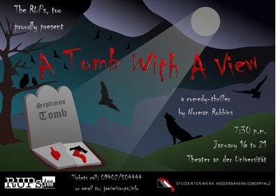 Nachdem im letzten Schuljahr der Besuch im Studententheater der Universität Regensburg bei der teilnehmenden Q12 großen Anklang fand, machten sich auch heuer wieder mehr als 50 Schüler, diesmal der 10ten Jahrgangsstufe, auf den Weg nach Regenburg, um dort die an der Universität aufgeführte Krimikomödie "A Tomb with a View" anzusehen - die neueste englischsprachige Produktion von den RUPs (Regensburg University Players).