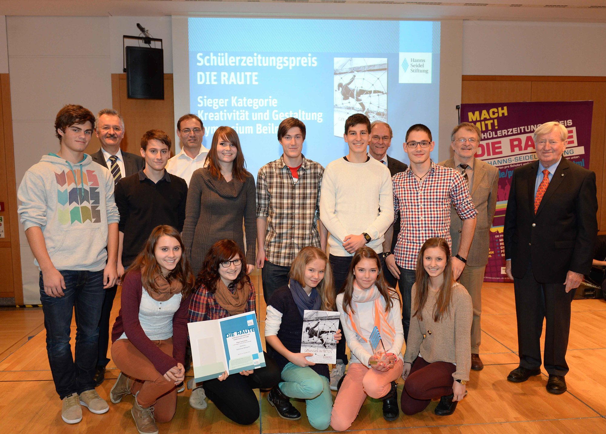 Mit der Verleihung der Trophäe "DIE RAUTE" konnte die erfolgreiche Serie an Preisgewinnen für die Schülerzeitung "Konkret" fortgesetzt werden. Die Redaktionsmitglieder, die sich aus dem P-Seminar Ethik und dem Wahlkurs "Journalistisches Schreiben" zusammensetzen und die in Begleitung des Schulleiters Reinhard Bauer sowie des betreuenden Lehrers Georg Denicolo zur Preisverleihung nach München fuhren, freuten sich besonders über diesen Preis, denn DIE RAUTE hat sich in den vergangenen Jahren zu einem begehrten Preis für Schülerzeitungsredaktionen entwickelt. 210 Schülerzeitungen hatten sich an der diesjährigen Ausschreibung der Hanns-Seidel-Stiftung beteiligt. Dr. Peter Müller, Amtschef im Bayerischen Kultusministerium, und Stiftungsvorsitzender Prof. Hans Zehetmair überreichten in München den mit insgesamt 4.500 Euro dotierten Preis an fünfzehn Redaktionsteams.