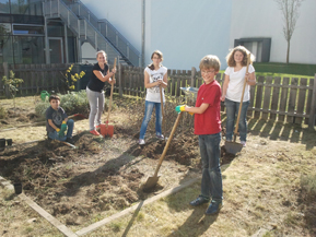 Schülerinnen der 5. und 8. Jahrgangsstufe zum Arbeiten im Schulgarten.