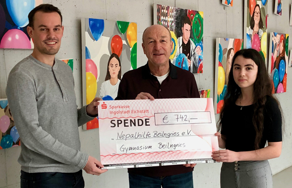 08.02.2019 Die Teilnahme an der bundesweiten Kampagne „Dein Tag für Afrika“ organisierte im vergangenen Schuljahr die Schülersprecherin Aalijah Donaubauer zusammen mit der verantwortlichen Lehrkraft Thomas Haas. Wie bereits im letzten Jahr entschied sich die SMV des Gymnasiums Beilngries dafür, die Hälfte des Geldes, das die Schülerinnen und Schüler der 10. Jahrgangsstufe an einem Tag der letzten Schulwoche in verschiedenen Betrieben der Umgebung erarbeitet hatten, der „Nepalhilfe Beilngries“ zu spenden.