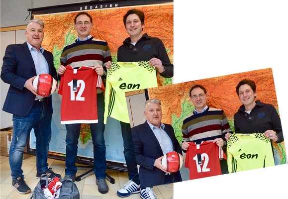 Am Tag der offenen Tür des Gymnasiums Beilngries übergab Robert Donaubauer (links), Vorsitzender des Elternbeirats, den beiden Organisatoren der Schülerexkursion nach Nepal, Christoph Ströbel (rechts) und Georg Denicolo (Mitte), zehn Lederfußbälle sowie einen kompletten Satz Mannschaftsbekleidung. Auf Vermittlung des Elternbeirats spendete die Firma E.ON die Fußballausrüstung im Wert von 500,- Euro nepalesischen Grundschülern, die die Beilngrieser Gymnasiasten im April 2019 besuchen werden. |